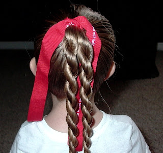 -three or four messy buns, tied off with ribbons that have slipped out of their bows (so excited to start her day that she rushes through getting ready/etc)