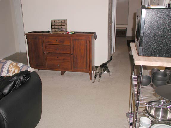 For others, click on these links:Cat standing next to the new dresser, taken because Mom hasn't seen the dresser yet.