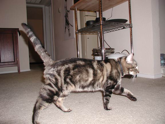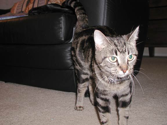 I went by the local animal shelter and adopted a cat today. She's adapted amazingly quickly - she hid in a space where two bookshelves on different walls almost meet, forming a cat-sized space, but I eventually tempted her out with some tuna. She goes and hides under the sofa for a while, and then when I talk to her or bend over and look at her, she comes out and purrs at me. She'll follow me around the apartment and explore whatever room I'm in, then go hide for a while. So - she likes me but is a bit weirded out by the new surroundings. She doesn't like those spring doorstops - the ones that go Boioioioioioioioioioingggggggg! when you hit them. I accidentally bumped into one, and she stared at it, and I hit it a couple more times and the fur along her spine started to rise. And every so often she'll wander over towards the door and stare at the doorstop for a few seconds.